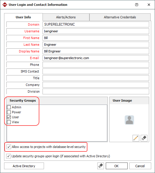 2. User Accounts: Assign the appropriate security group(s) to each user account. For the example shown below, the user will have read/write permissions in projects that are assigned to "Department A," and read-only access in projects that are assigned to "Read-Only."