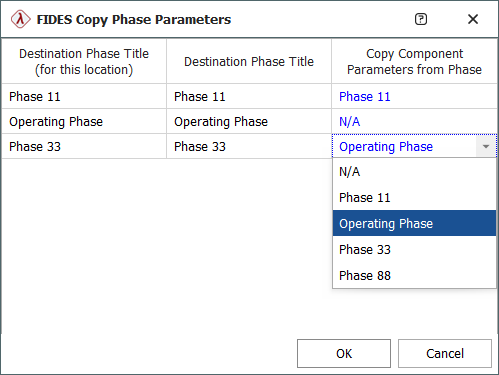 - If the destination location has no phases assigned to it, the FIDES Copy Phase Parameters window will not appear and no phase-specific parameters will be copied with the components.
