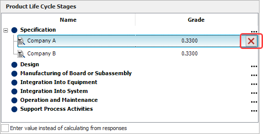 If you prefer to enter the process audit value directly, select the Enter value instead of calculating from responses check box at the bottom of the window. The life cycle stages area will become disabled and you can enter a number (within the allowable range for that factor) into the Value field.