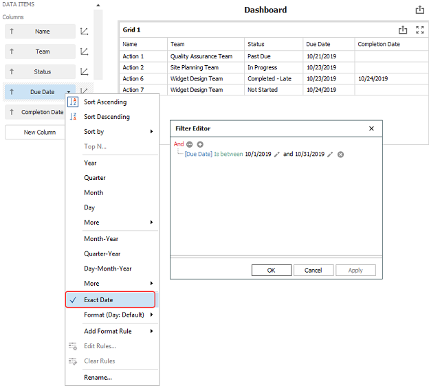This grid uses the Exact Date for two date fields to show a list of all actions in the current plan that are due in the current month. (To set the criteria that filters the records shown in the grid, right-click inside the chart and choose Edit Filter.)