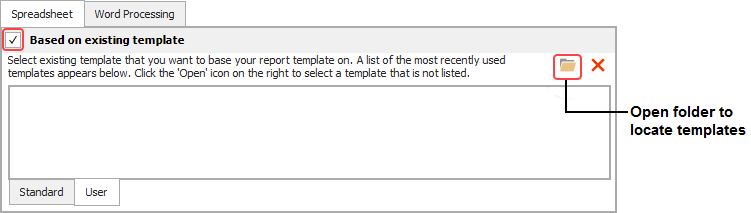 Click Spreadsheet or Word Processing. Select the Based on Existing Template check box and then choose a template from either the Standard tab (templates that are installed with the software) or the User tab (templates you have saved). Then click OK to create the report. (See ReliaSoft Workbook Templates.)