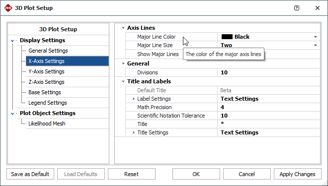 To save your changes and use them as the default setting for all new 3D plots, click the Save as Default button. This will overwrite the previous default settings.