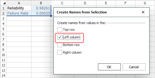 Define a Name via the Selection Command (ReliaSoft Workbook Only)