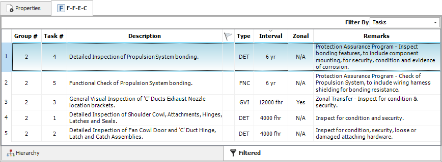 When working in the Functional Failure Analysis, you can use the filtered view to show only records of a specific type (e.g., functions, failures, etc.). To use the filtered view, click the Filtered tab at the bottom of the Analysis panel. You can then choose the record type that you want to view from the Filter By drop-down list in the upper right corner. The Analysis panel will change to display only the records of the specified type, as shown next for tasks sorted by interval.