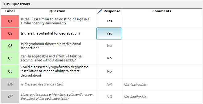 To answer a question, click inside the Response column to toggle between Yes and No. A "Yes" answer to any of the questions will enable the L/HIRF > Analysis > Add ED/AD Analysis command on the ribbon.