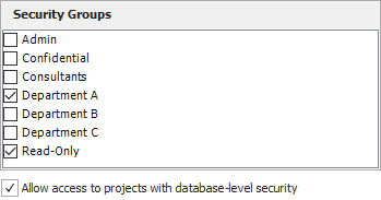Select or clear the Allow access to projects with database-level security check box. If some of the projects in the database will continue to use database-level security, this allows you to specify whether each user will be able to access those projects.- If the option is selected (default), the user will be able to access any public/reference project that is set to use database-level security, with the combined permissions from any of the assigned security groups.
