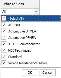 FMEA records in XFMEA/RCM++ also have the option to include text from selected phrase sets.