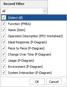 When the descriptions can be obtained from more than one type of analysis (e.g., when PFMEA failures can be copied from FMEA causes, or when control plan operations can be copied from PFD Worksheet operations), the headings in the table identify the source. You can use the Record Filter to specify which source(s) to include.