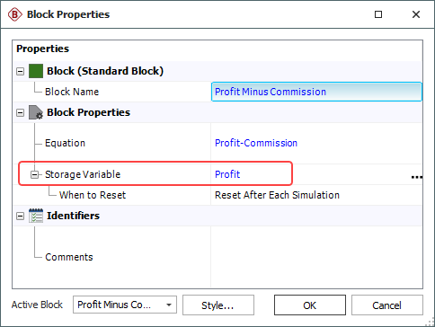 The following picture shows the Block Properties window of the third block in the flowchart. The equation shows that the commission is deducted from the existing value in the variable, and then the variable is overwritten with the new result. At the end of the simulation, the result storage block in the flowchart stores the final value of the variable, and then the variable resets to 0.