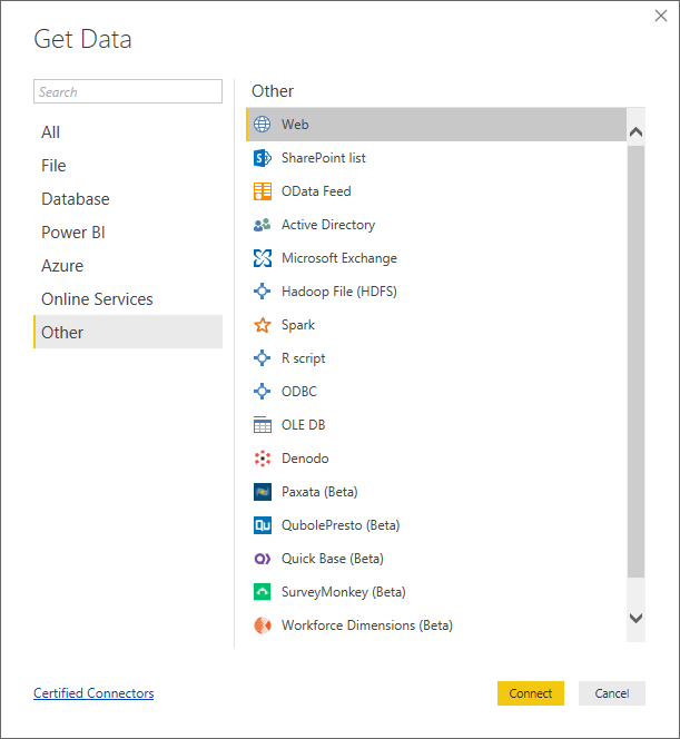 - In the Get Data dialog box, select Other > Web and click Connect.