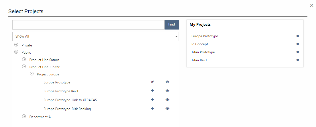 To add or remove projects from this list, click Select Projects. In the Select Projects popup window, the right side shows your list of projects and the left side shows all the projects that you have permission to view.