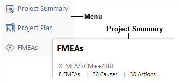 The FMEAs link in the menu opens the FMEAs page for the project that is currently active for you in SEP. This link also appears in the Project Summary page if the project contains FMEA data.