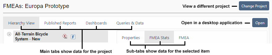 To view the FMEAs from a different project, click the Change Project button at the top of the FMEAs page.