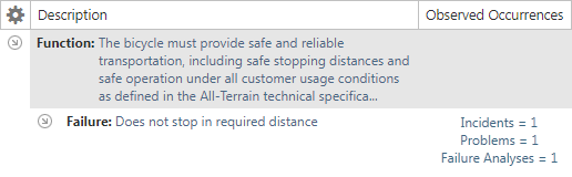 To view the quantity of XFRACAS records that have been reported for a failure for a specific item, make sure the Observed Occurrences column is displayed in the FMEA hierarchy. (See "FMEAs.")