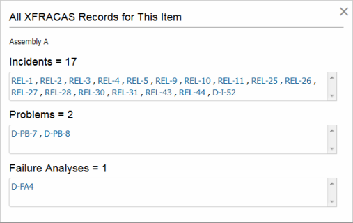 This opens a pop-up box showing all XFRACAS records for items that are identified as the "Responsible Part" for an incident, the "Part Category" for a problem or the "Repaired/Replaced Part" for a failure analysis. To open the incident, problem or failure analysis in SEP, click the record number .