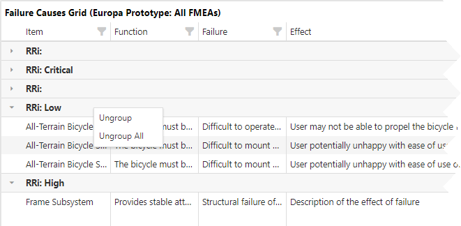 - To undo the grouping, click the heading row within the grid and select either Ungroup or Ungroup All in the pop-up box. Alternatively, you can right-click any other column heading and select Ungroup All.