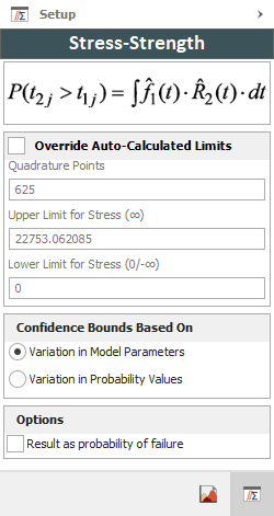 The Setup page of the control panel contains options for setting how you want the probability value to be computed. The following picture shows the Setup page of a stress-strength folio.