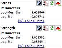 - The control panel also displays the values of the parameters of the distribution for each data set. For the stress-strength comparison test (as shown in the picture below), the first data set represents the Stress and the second data set represents the Strength. For the life comparison test, these are displayed as Set 1 and Set 2.