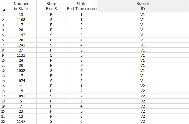 The following data sheet shows the data for the product. The return period (State End Time) is measured in months. The manufacturer logs the number of failures and suspensions for each product version at the end of each month.