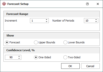 - In the Forecast Setup window, set the increment to 1 and set the forecast length to 10 periods, as shown next. Click OK.