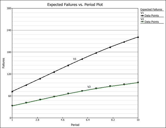 - Click the Plot icon on the control panel of the Forecast sheet. In the Plot Type drop-down field, choose Expected Failures. The following plot shows the trend in the expected number of failures over the next 10 periods. This forecast analysis can help the manufacturer predict the failure behavior of each product version in the field, as well as plan for the warranty costs and service for each product version.