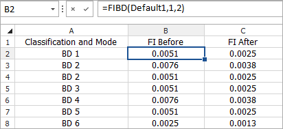 The following table is for a particular data set analyzed with the Crow Extended model. For example, it shows that for BD1, the FI before the fixes is 0.0051 and the FI after the fixes is 0.0025.