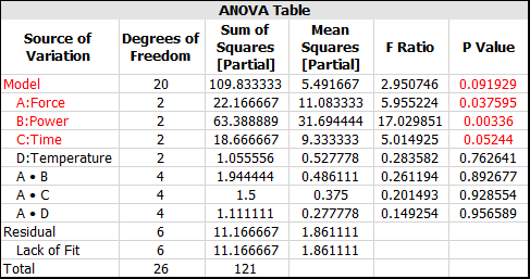 From this table, you can see that effects A, B, C are significant. To simply the analysis, the next step is to recreate the model using only the significant terms.