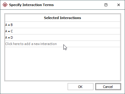 - To have the software determine which columns in the array will be assigned to the factors, click the Specify Interaction Terms link. In the window that appears, enter all possible two-way interactions between the factors being investigated. The easiest way to do this is by repeatedly clicking the row that says "Click here to add a new interaction" until the row disappears.