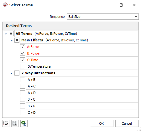- In the Select Terms window that appears, click the Select Significant Effects button to select only the significant effects to calculate the new model, as shown next, then click OK.