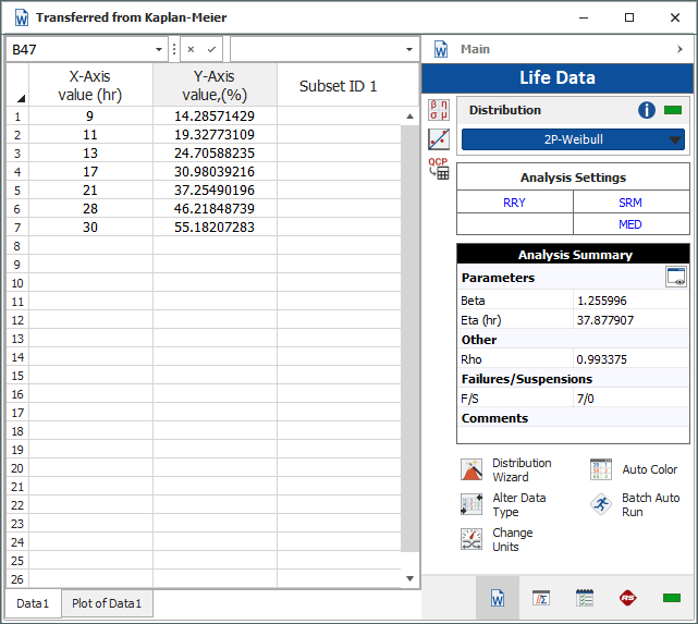 To assess whether the assumed distribution (that was chosen in the Life Data Model area of the control panel) provides a good fit, transfer the results of the non-parametric analysis to a Weibull++ life data folio.