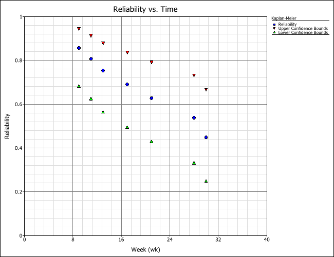 In the following example, the dots on the plot show the reliability estimates at each point of failure, the triangles show the lower 1-sided confidence bounds of the estimates, and the inverted triangles show the upper 1-sided confidence bounds. The pattern of the data points shows that the product exhibits a sharp decline in reliability over the course of a few weeks.