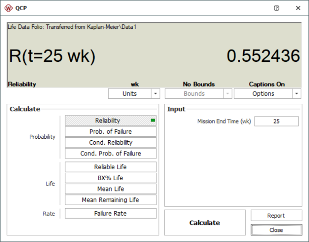 - In the QCP, choose to calculate the Reliability. Select Week for the time units and then enter 25 for the mission end time. Click Calculate to display the results. The reliability is estimated to be 55.2436%, as shown next.