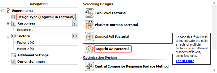 - Click Design Type in the folio's navigation panel, and then select Taguchi OA Factorial in the input panel.