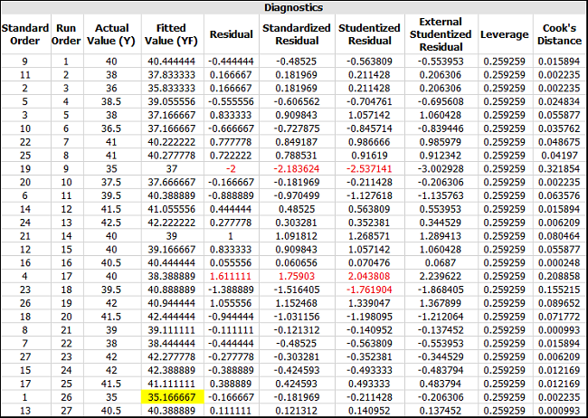- Click the View Analysis Summary icon on the control panel. In the Analysis Summary window that appears, view the Diagnostic Information table. The table is shown next. In order to identify which factor settings can provide the smallest ball size (and hence the best process), look for the runs in the table with the Fitted Value (YF) closest to zero (highlighted).