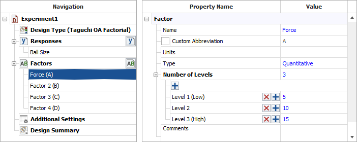 - Define each factor by clicking it in the navigation panel and editing its properties in the input panel. The properties are given in the table above. The first factor is defined as shown next. (Note that every factor must be configured to have three levels.)