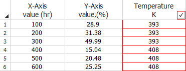 To use this data type, select the Free-form (probit) data check box in the setup window. In the data sheet, enter the values for the independent variable in the X-Axis value column and enter the cumulative percentage of failures in the Y-Axis value column. The following is an example of a data set that shows the effect of time (x-axis data) on the probability of failure (y-axis data) at specified stress levels of a product.