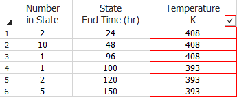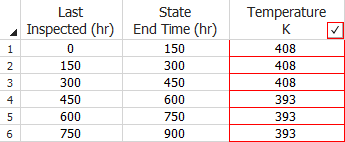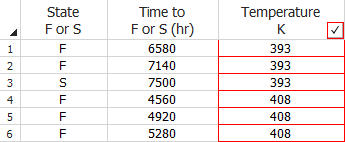 If multiple units failed at the same time, you can choose to enter the data in groups. To do this, select the My data set contains rows that represent multiple units (Grouped data) check box in the setup window. This adds a third column to the data sheet, as shown next. In this example, the units that failed at the same time are grouped together. The Number in State column indicates the number of failed units in that group (the software will automatically enter a 1 if you leave this cell blank) and the State End Time column indicates the exact time the units in each group failed.