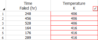 To use this data type, select the Times-to-failure data check box on the setup window. Your data sheet will have a Time Failed column for recording the times-to-failure. The example shown next displays a life-stress data folio data sheet where all the units in the sample failed. The exact time of each failure is recorded.