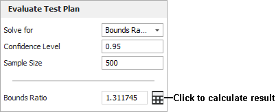 - From the Solve for drop-down list in the control panel, choose the value you wish to solve for. The two input fields immediately below the drop-down list will change depending on what you choose. For example, if you choose Sample Size, the two input fields will be Confidence Level and Bounds Ratio.
