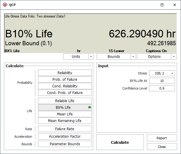 - To obtain the two-sided 90% confidence bounds on the product's B10 life, click the Quick Calculation Pad icon on the control panel.