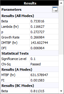 When you calculate a multi-phase data sheet with the Crow Extended – Continuous Evaluation model, the following results will be displayed on the Main page of the control panel. By default, the Results area displays the results from all failure mode classifications first. Use the scroll bar to see results that only apply to failure modes with a particular classification (A, BC and BD), as shown next.