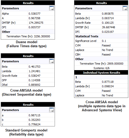 - Whether the data set passed or failed the applicable goodness-of-fit tests that are performed automatically when you calculate the parameters (applies to the Crow-AMSAA model only). Only the test(s) that apply to the data type you are using will appear in the results. (See Statistical Tests.)
