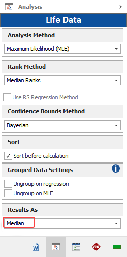 By default, Weibull++ calculates the point estimates from the median value of the posterior distribution. This is because the median value always corresponds to the 50th percentile of a distribution. You have the option to change this setting and calculate the mean value of the posterior distribution instead; however, note that the mean is not a fixed percentile and this could cause issues when comparing results across different data sets. The option to change this setting is available on the Analysis page of the control panel when you choose the Bayesian-Weibull analysis, as shown next.