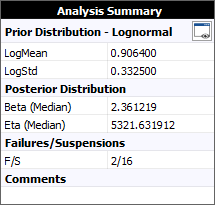Note that instead of a single calculated value for each of the parameters, the parameters of the Bayesian-Weibull distribution are distributed. This result is known as a posterior distribution. In the example, the result showing that Beta (Median) = 2.3612 means that the median value of the posterior distribution of the beta parameter is 2.3612. For convenience, this is used as the single point estimate for the beta parameter.