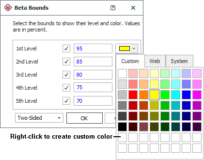 - You can click the color field to define the line color for the beta bound. To add a new color to the Custom tab, right-click one of the color boxes in the bottom two rows.