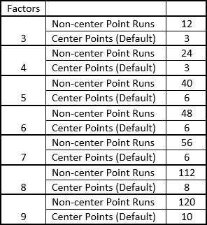 This table provides information about how many non-center point runs will be used in the design, based on the number of factors, as well as how many center points will be used by default. For example, if you are using 5 factors, the design will use 40 non-center point runs and will use 6 center points by default.