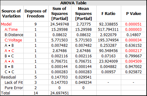 In the ANOVA table, you can see that effects A, C, AC and AA are significant. The p value for factor B is 0.1481, which is close to the risk level of 0.1. Therefore, you decide to include it in the final model.