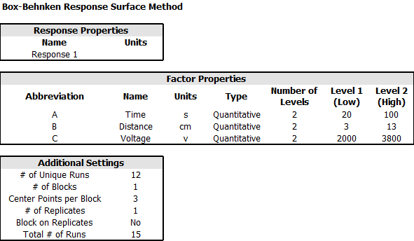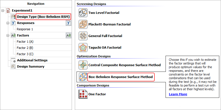 - Click Design Type in the folio's navigation panel, and then select Box-Behnken Response Surface Method in the input panel.