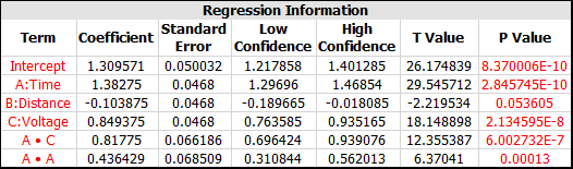 The results in the Analysis Summary area on the control panel show that time (A) and voltage (C) have significant effects on the reduction of the fungal spores, as well as AA (the quadratic effect of A) and the interaction of AC.