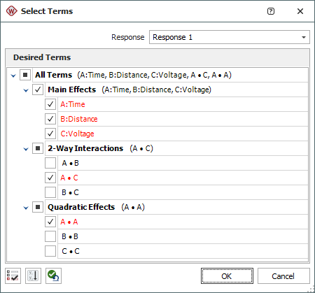 - Make sure all main effects and interactions will be considered. To do this, click the Select Terms icon on the control panel.